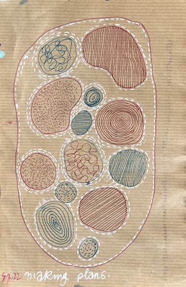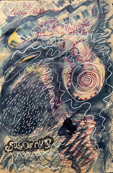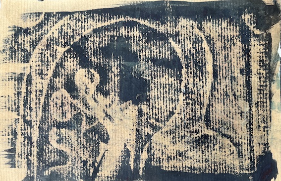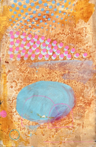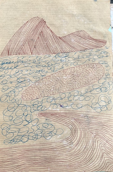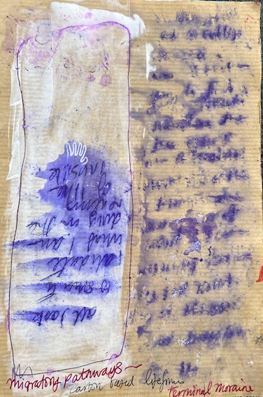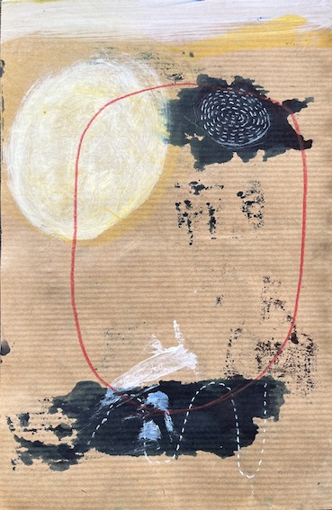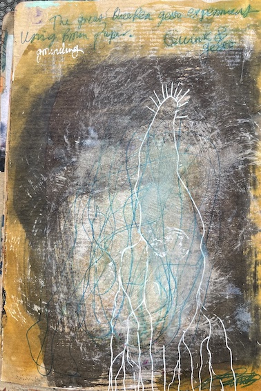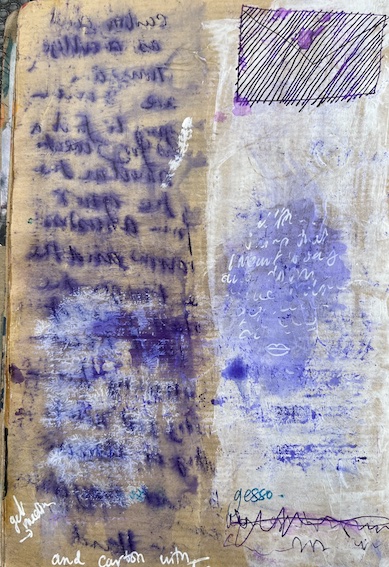 Sketchbook pages Dec26 A4 acrylic and mixed media experiments. Using recycled text and remnants Hares rest Bread Umber Excavated landscape